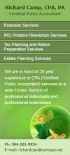Richard Camp, Certified Public Accountant, 20 years experience in accounting services for small business owners and even to individual professionals., as a certified public accountant Florida, Richard and his team doing an excellent legal assistance services for the development of businesses and about professional growth in specific field. Richard has trained and experienced accountant staffs practiced with MBA and they are qualified to assist business owners.